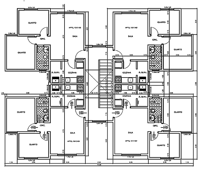 Edificio: 4 pisos, con 16 departamentos por bloque.